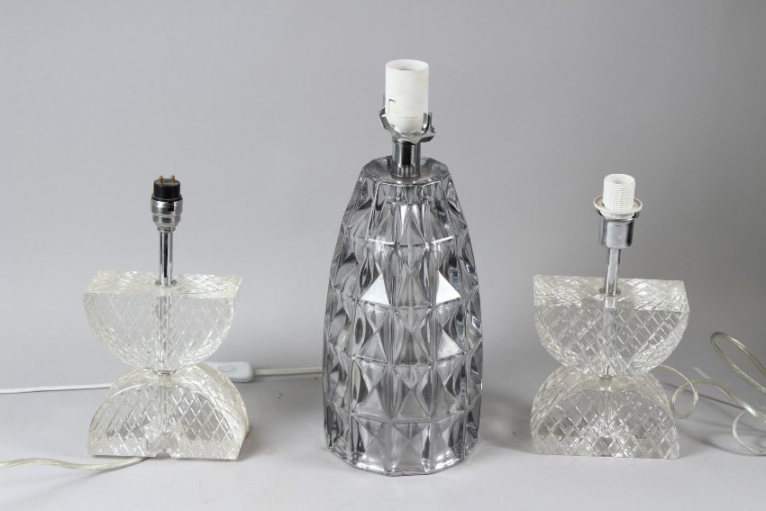 A STYLISED MOULDED GLASS TABLE LAMP; together with a pair of cut glass table lamps. 36cms and 27cms high.