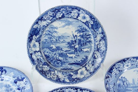 A 19TH CENTURY DAVENPORT TRANSFER PRINTED BLUE AND WHITE PLATE depicting the Villagers, together with a Wedgwood plate with a figure on horseback in a landscape, another titled Gamekeep and a plate depicting figures and a horse by a cottage, river and bridge.