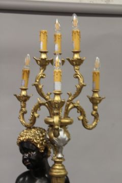 AN ORNATE BLACKAMOOR FIGURAL FLOOR STANDING SIX LIGHT CANDELABRA, on a pedestal base.