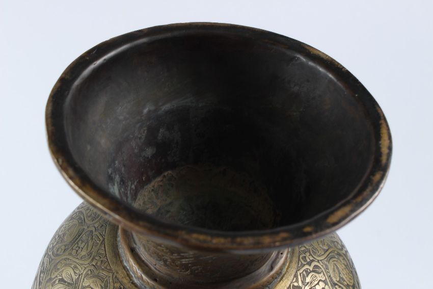 A FINE AND LARGE INDO PERSIAN ENGRAVED BRASS BOTTLE VASE.