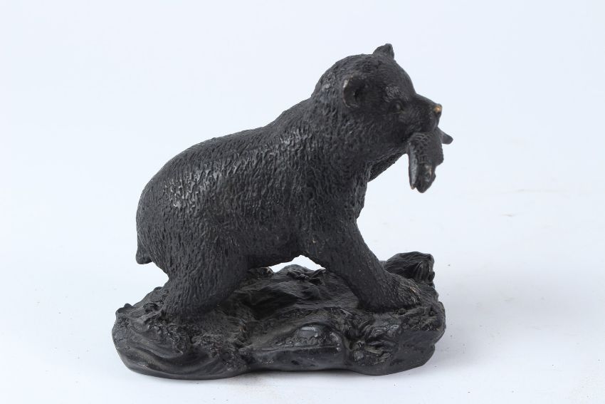 A SMALL BRONZE FIGURE OF A BEAR WITH A FISH IN ITS MOUTH.