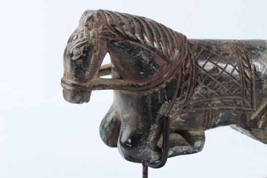 AN INDIAN CARVED GREEN HARDSTONE FIGURE, 19TH / 20TH CENTURY, modelled as the front end of a horse, on a later stand.