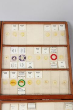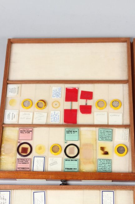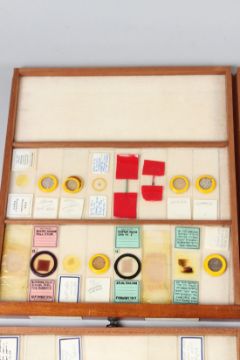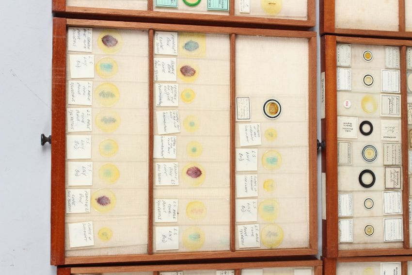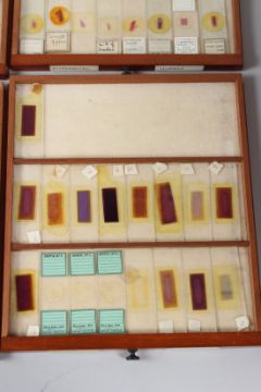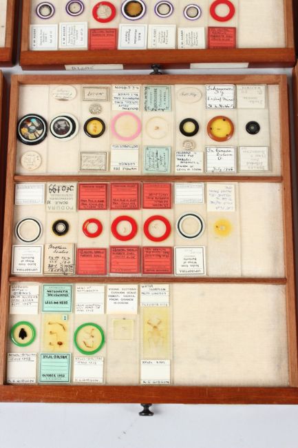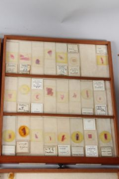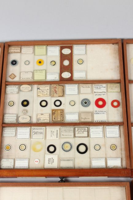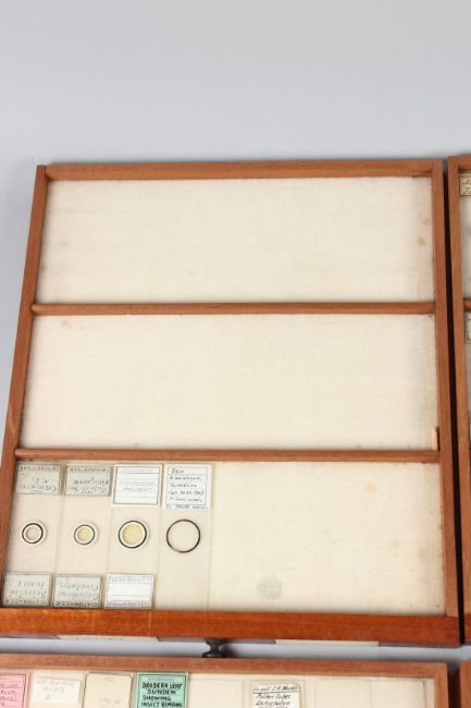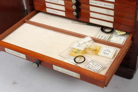 R. & J. BECK, LONDON, A MAHOGANY TABLE TOP SINGLE DOOR CABINET, containing 21 numbered drawers of microscope slides.