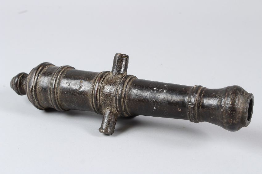 A RARE 17TH-18TH CENTURY, POSSIBLY INDIAN, MINIATURE BRONZE CANNON. 28cms long.