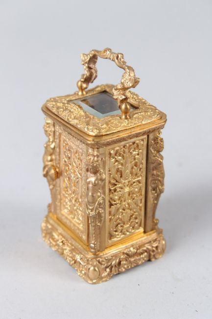 A MINIATURE CAST AND GILDED METAL CARRIAGE CLOCK.