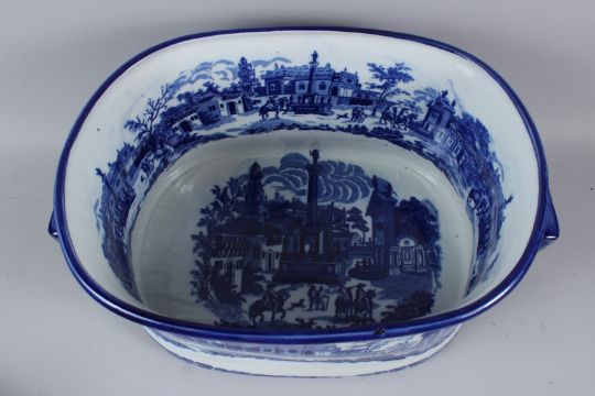 TWO REPRODUCTION BLUE AND WHITE PORCELAIN FOOTBATHS.