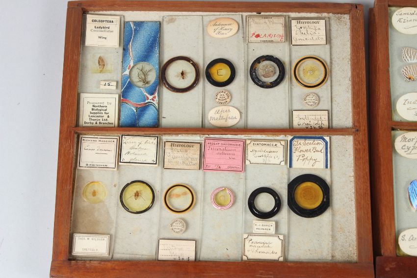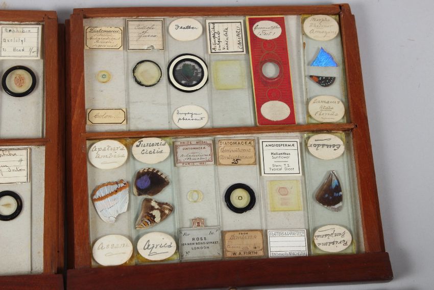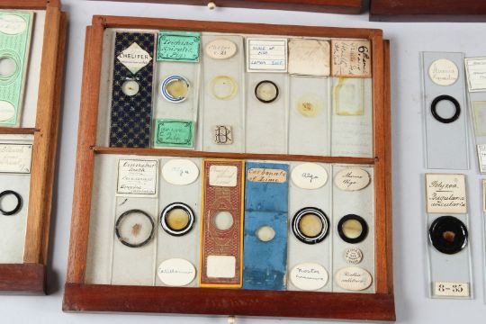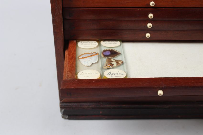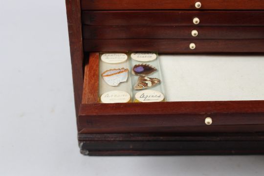 A SMALL MAHOGANY SINGLE DOOR TABLE TOP CABINET, containing 11 drawers of microscope slides.
