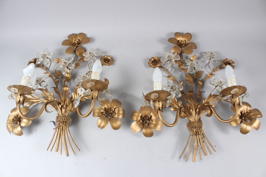 A PAIR OF NATURALISTIC FORM ORMOLU AND CUT GLASS TWIN-BRANCH WALL APPLIQUES.