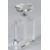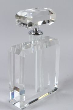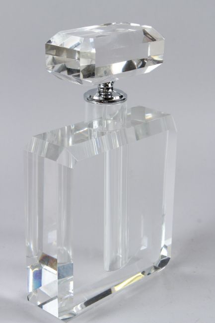 A LARGE GLASS "CHANEL No. 5" STYLE CUT GLASS SCENT BOTTLE.