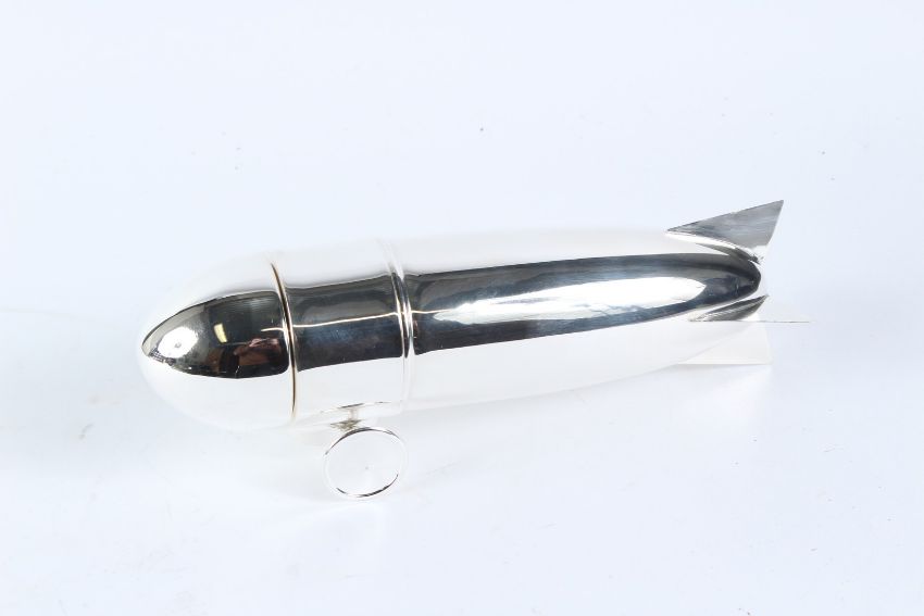 A PLATED ZEPPELIN COCKTAIL SHAKER with wheels.