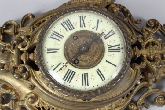 AN ORNATE CAST BRONZE CARTEL CLOCK with enamel dial.