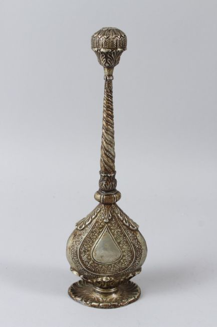 A FINE 19TH CENTURY INDIAN WHITE METAL ROSEWATER SPRINKLER.