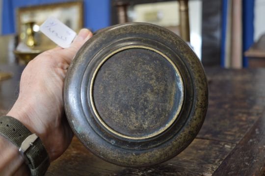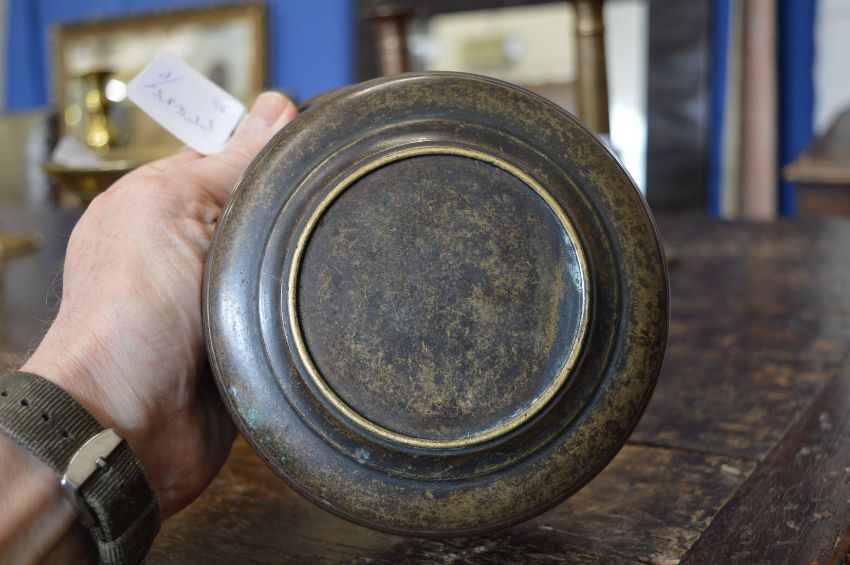 An early bronze bowl with swing handle.