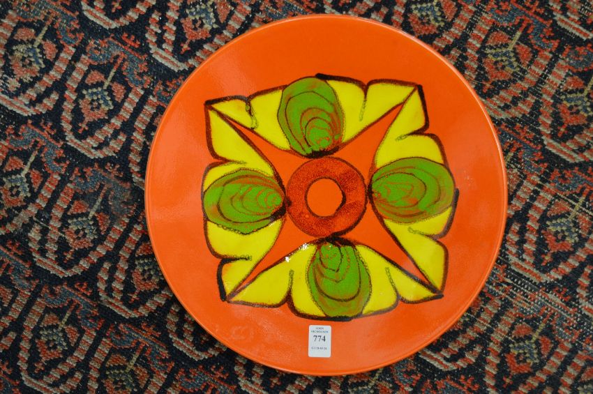 A Poole pottery orange glazed Delphis circular dish.