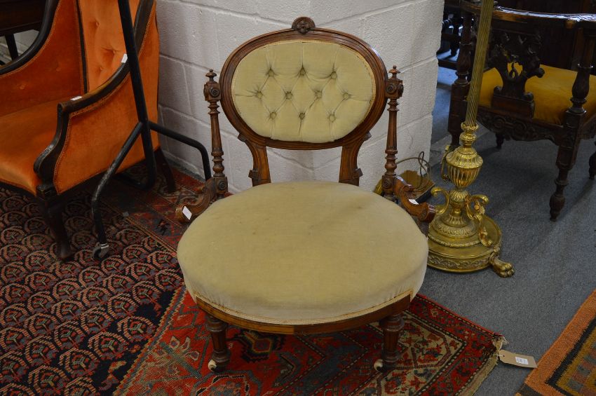 A Victorian walnut bedroom chair with carved show wood frame.
