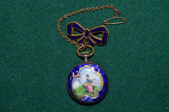 An enamel decorated ladies fob watch with matching bow shaped hanger (faults).