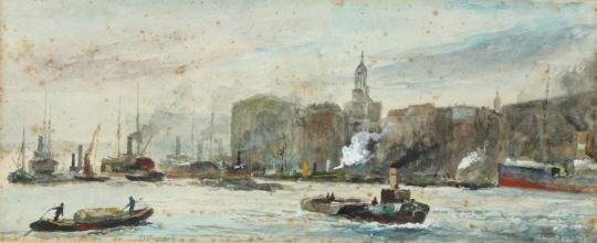 HENRIE PITCHER (19TH CENTURY) 'Billingsgate' River Thames view watercolour signed and inscribed, dated '75 15 x 37cm