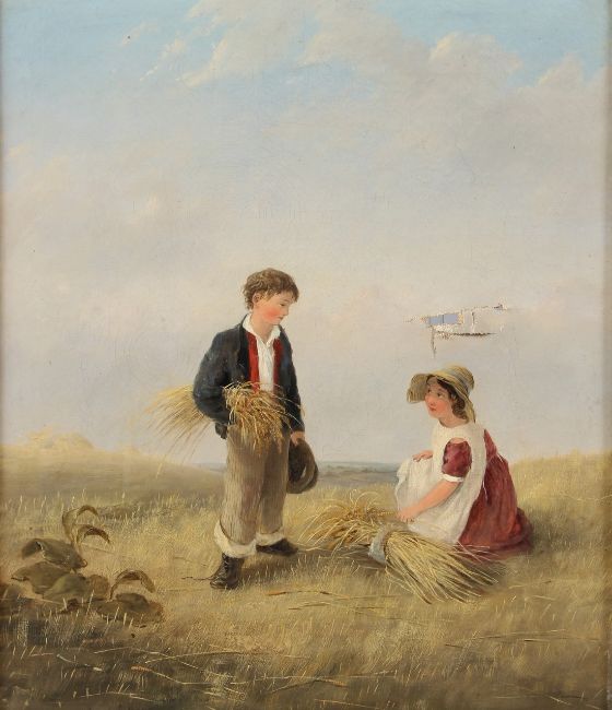 ENGLISH SCHOOL (19TH CENTURY) Two young harvesters in a field oil on canvas (a/f) 34x 29cm