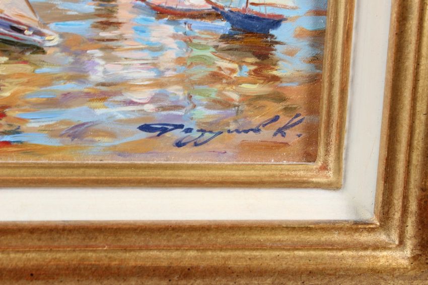 KONSTANTIN RAZUMOV (b.1974 RUSSIAN) On the seashore children playing on a beach with toy yachts oil on canvas signed Inscribed on the reverse in Cyrillic 25.5 x 33.5cm