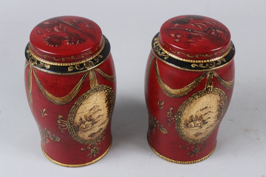 A PAIR OF RED TOLEWARE STYLE JARS AND COVERS.