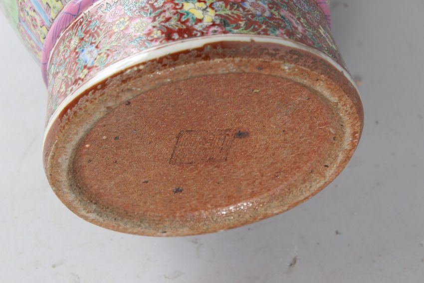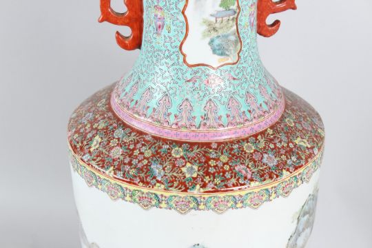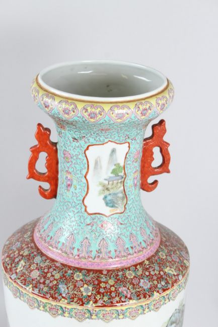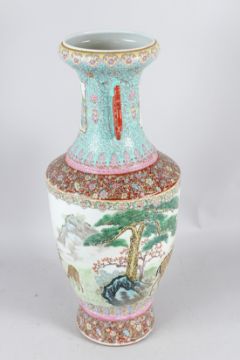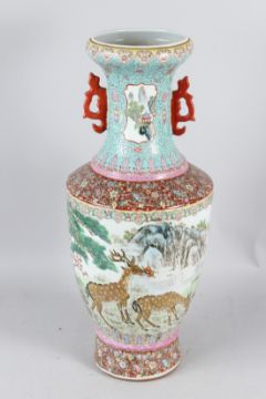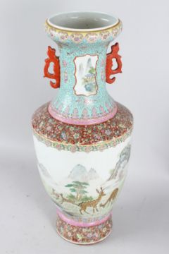 A GOOD LARGE CHINESE PORCELAIN VASE (REPUBLIC) hand-painted featuring a scenic design with deer and mountains on the body and intricate patterns on the neck and base.