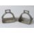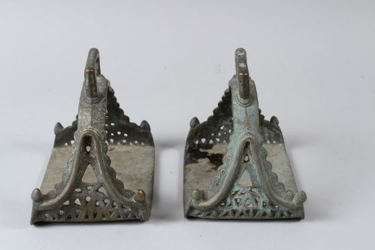A PAIR OF 18TH - 19TH CENTURY MUGHAL INDIAN BRASS HORSE STIRRUPS.