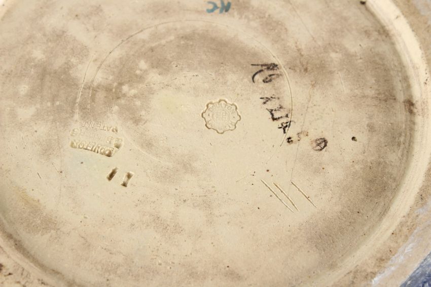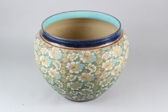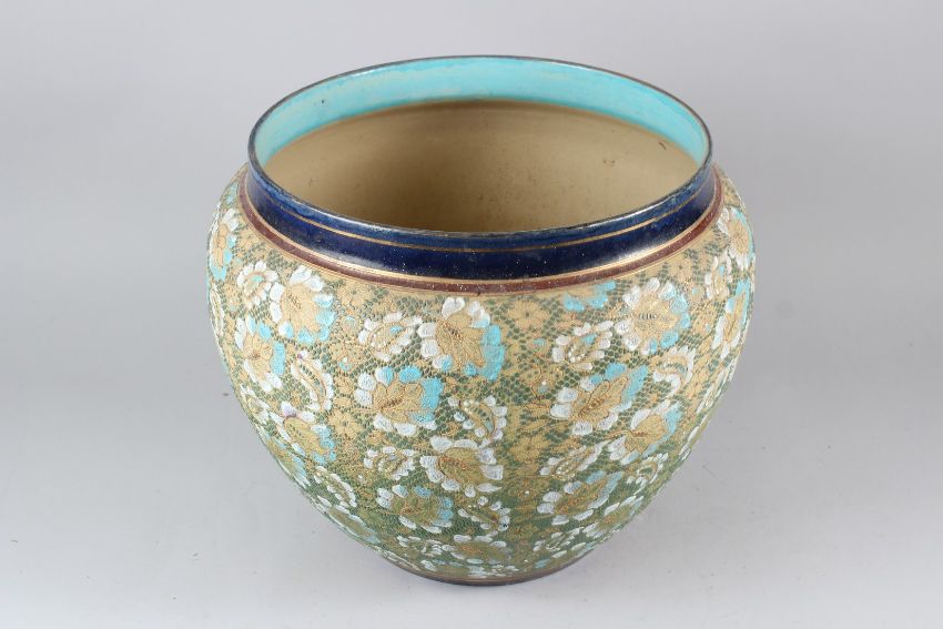 A LARGE ROYAL DOULTON SLATER'S PATENT CIRCULAR JARDINIERE, with floral decoration to the body.