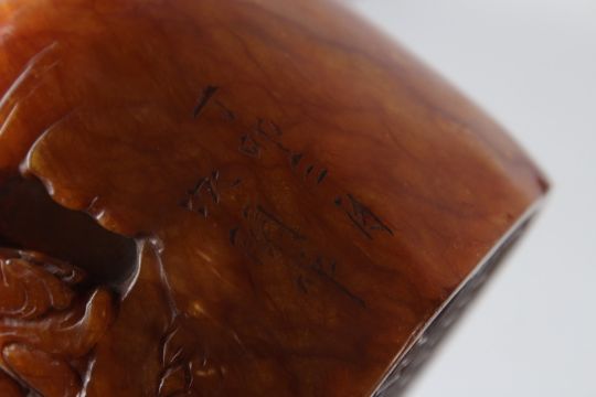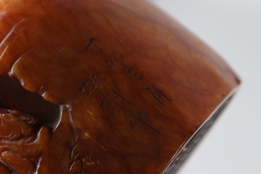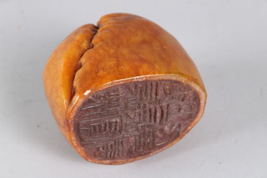 A FINELY CARVED LARGE CHINESE AMBER COLOURED STONE SEAL.