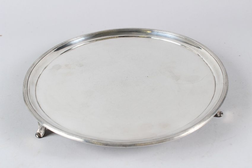 A GOOD CIRCULAR SILVER SALVER, with a reeded border on three scroll feet.