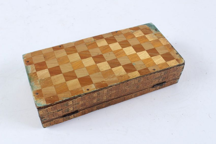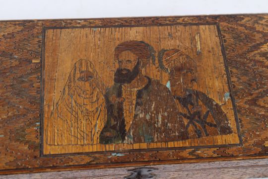 A VERY FINE 19TH CENTURY ISLAMIC, POSSIBLY NORTH AFRICAN, STRAW WORKED BOX DEPICTING ARAB FIGURES.