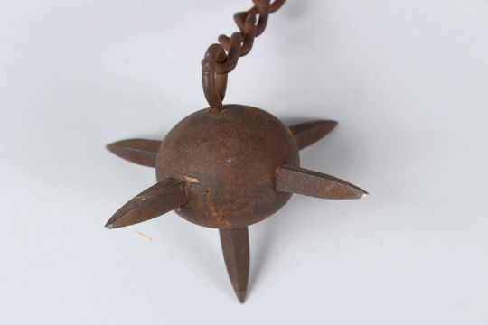 A EUROPEAN SPIKED FLAIL MACE, with wooden handle and steel chain and mace head.