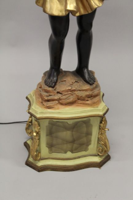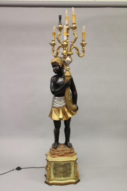 AN ORNATE BLACKAMOOR FIGURAL FLOOR STANDING SIX LIGHT CANDELABRA, on a pedestal base.