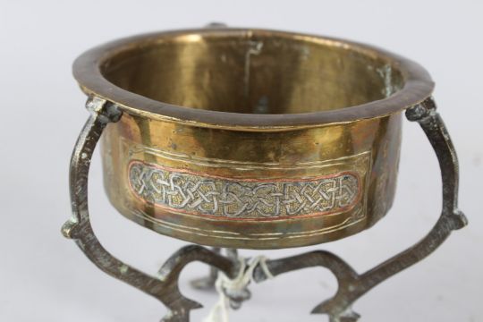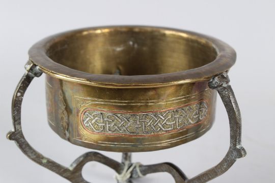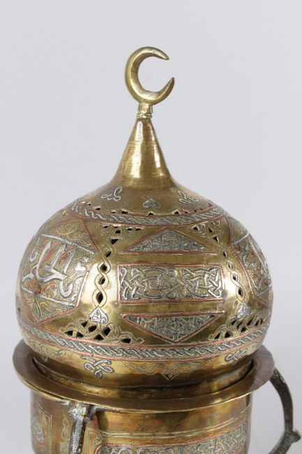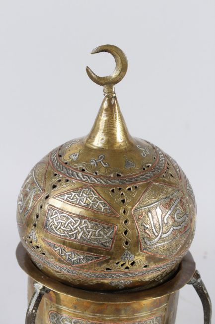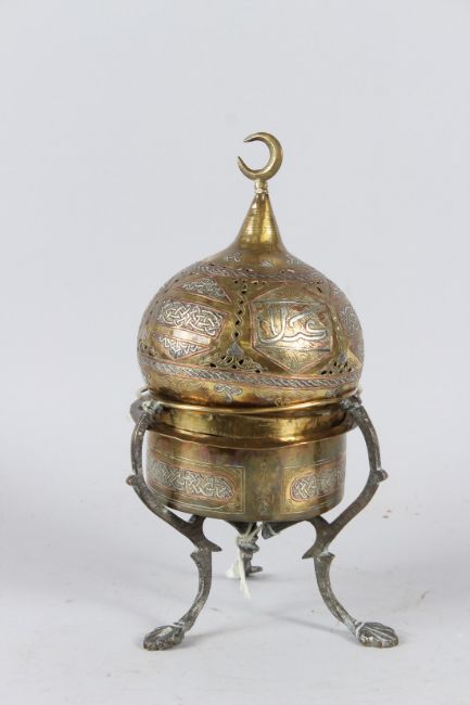 A FINE LARGE 19TH CENTURY SYRIAN DAMASCUS SILVER INLAID BRASS INCENSE BURNER.