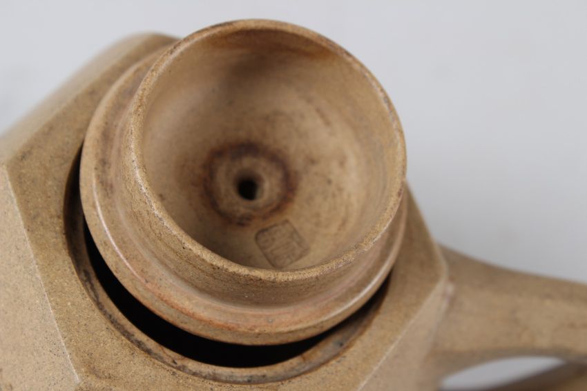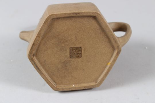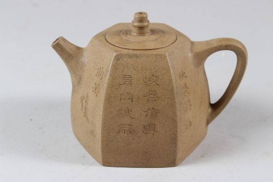 A CHINESE YIXING POTTERY TEAPOT, of hexagonal form, incised with calligraphy.