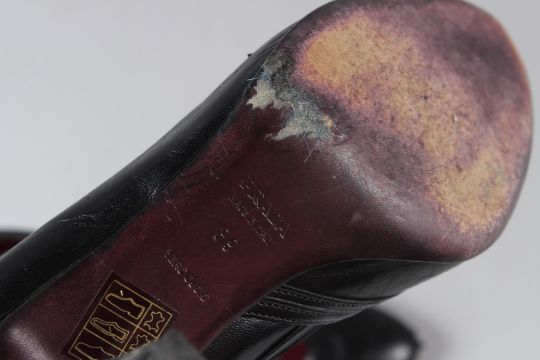 PRADA, A PAIR OF LADIES BLACK LEATHER HIGH HEEL SHOES, size 39.