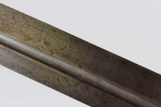 A LARGE 19TH CENTURY PERSIAN OR CAUCASIAN SILVER HILTED KINDJAL DAGGER with etched decoration on blade.