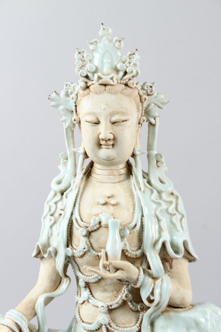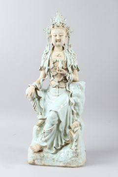 A FINE CHINESE "YINGQING" GLAZE GUANYIN FIGURE.