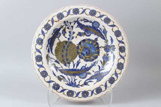 AN OTTOMAN TURKISH IZNIK POTTERY DISH, painted in blue and grey with stylised flowers.