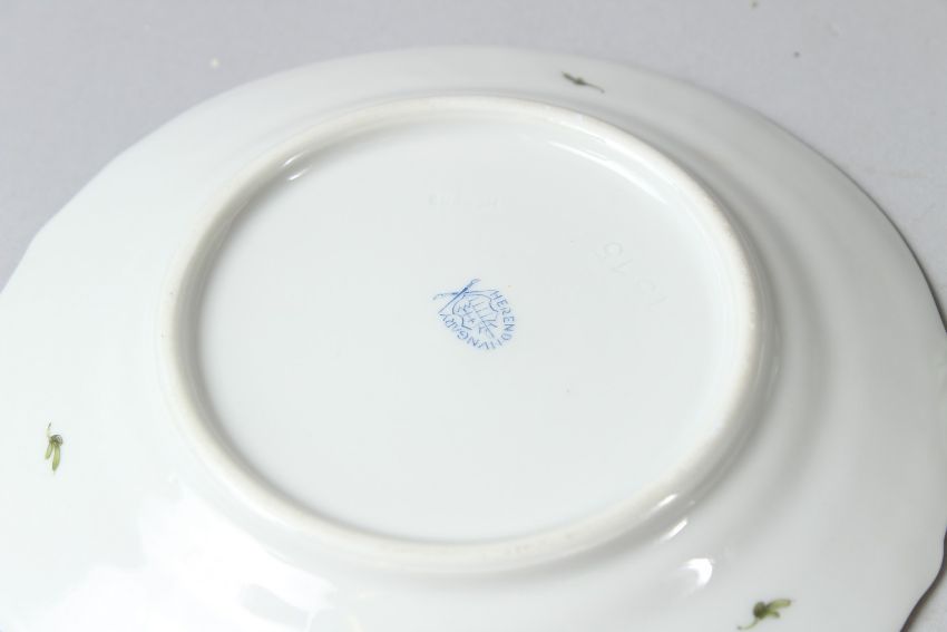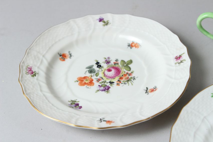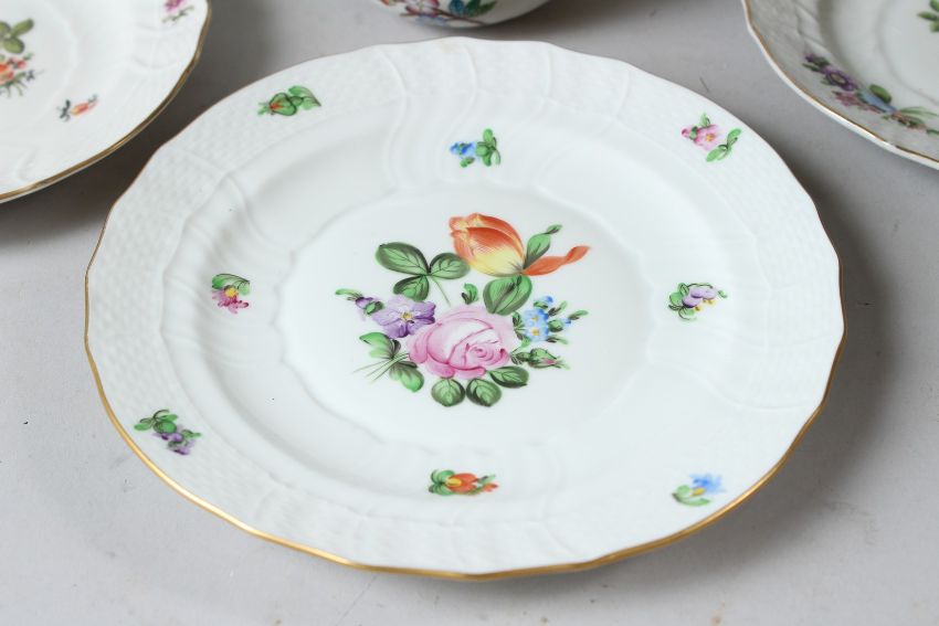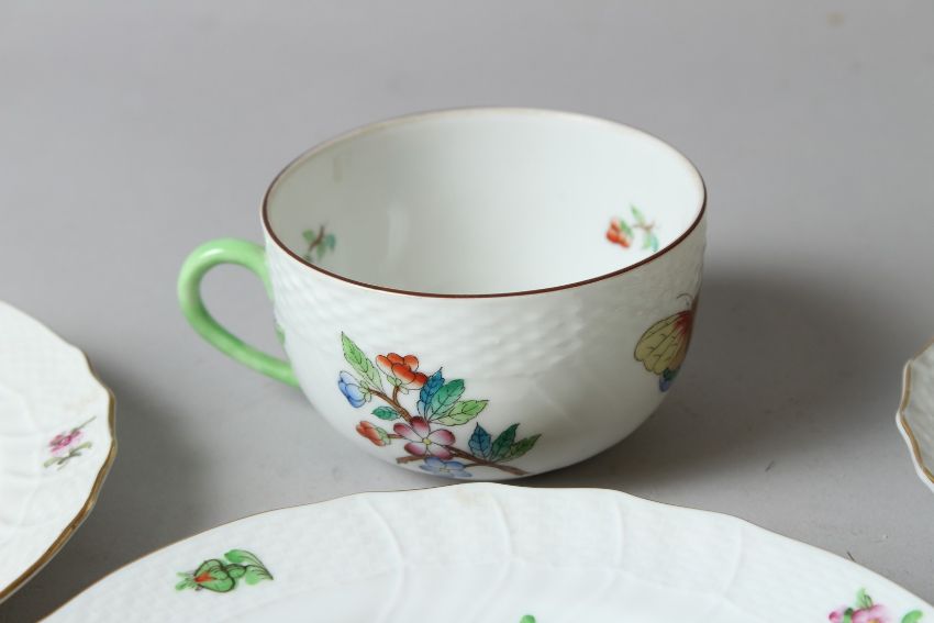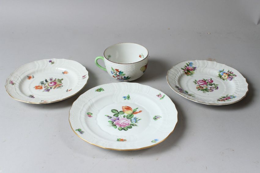 A HEREND PORCELAIN TEA CUP, TWO SMALL PLATES AND A SIDE PLATE, all painted with flowers.