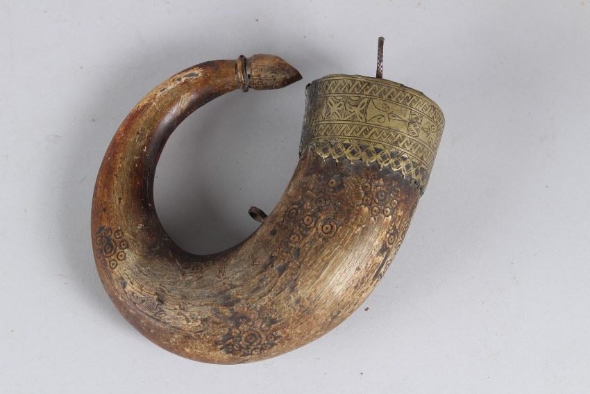 AN 18TH CENTURY INDIAN BRASS MOUNTED POWDER HORN.