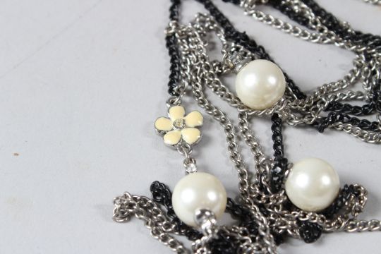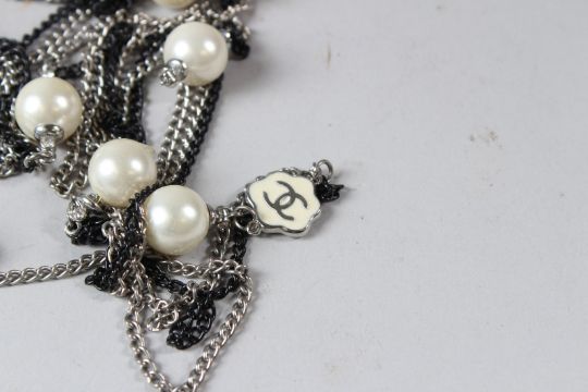 A CHANEL LONG NECKLACE, with black and silver coloured chains interspersed with pearls.
