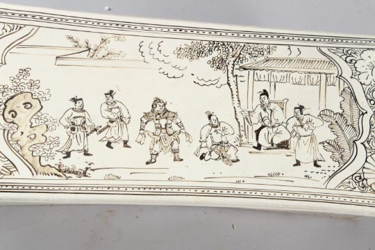 A CHINESE POTTERY PILLOW, painted with figures in a landscape.