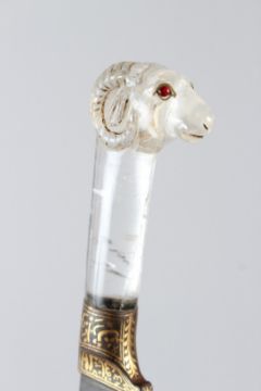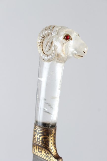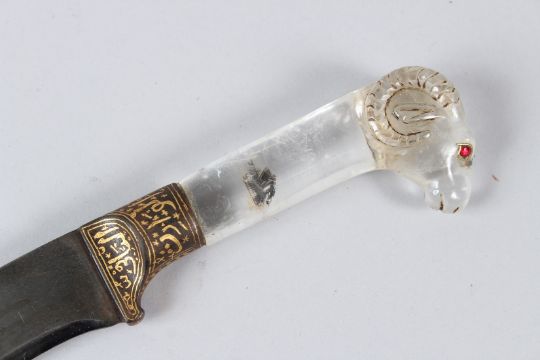 AN OTTOMAN KHANJAR DAGGER, with carved rock crystal handle in the form of a ram's head, gilt decorated hilt and plain curving blade.
