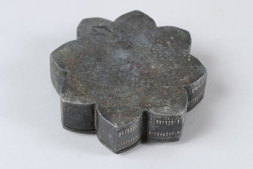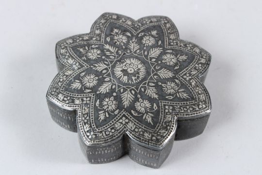 A FINE 19TH CENTURY INDIAN BIDRI SILVER INLAID BOX.