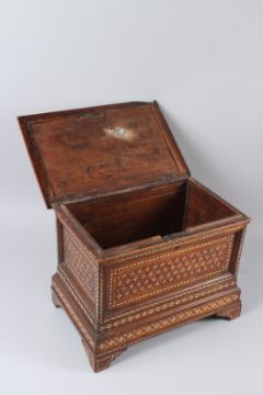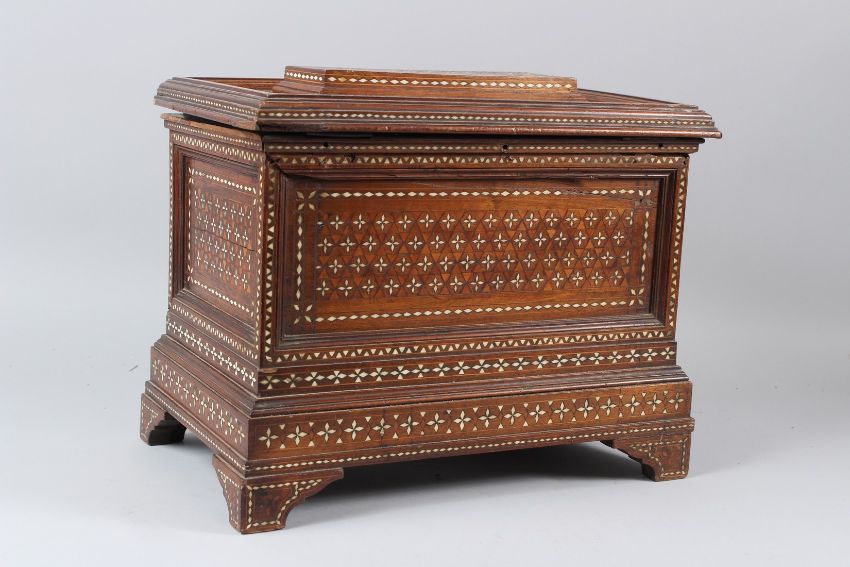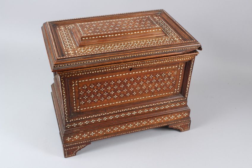 A VERY FINE EARLY, POSSIBLY 16TH-17TH CENTURY, SPANISH OR ITALIAN INLAID WOODEN CASKET in the Islamic style.