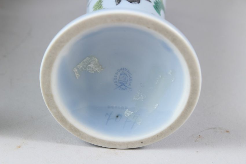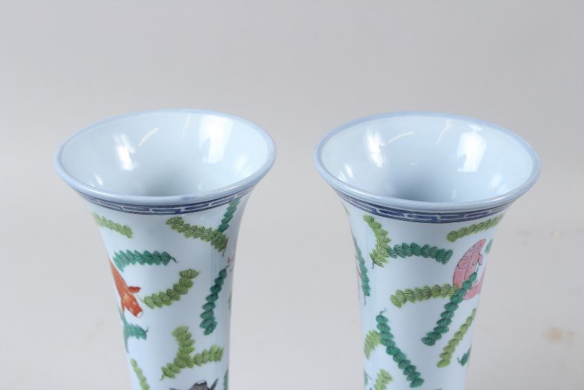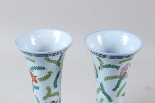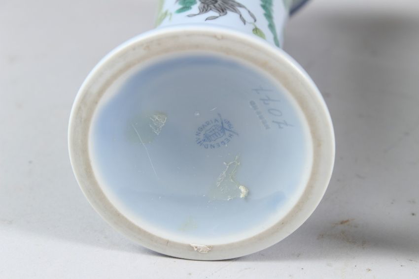 A PAIR OF HEREND PORCELAIN TRUMPET SHAPED VASES, pale blue ground, painted with fish and seaweed.