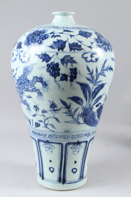 A LARGE CHINESE BLUE AND WHITE MEIPING VASE, with floral decoration to the shoulder, the body painted with lion dogs.