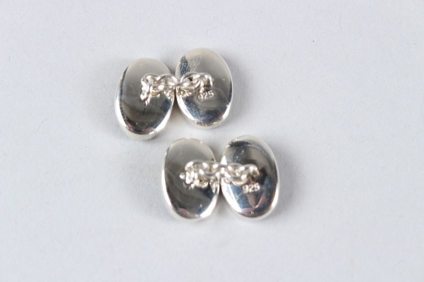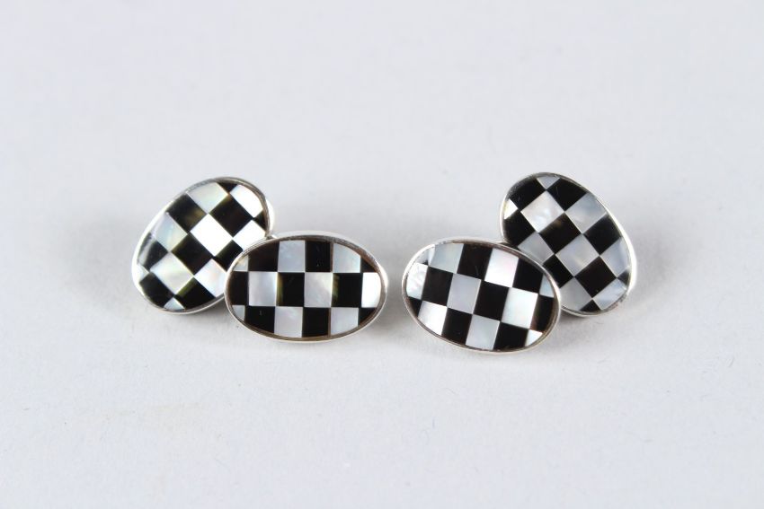 A PAIR OF SILVER, ONYX AND MOTHER-OF-PEARL CHEQUER CUFFLINKS.
