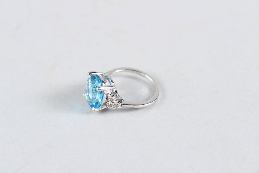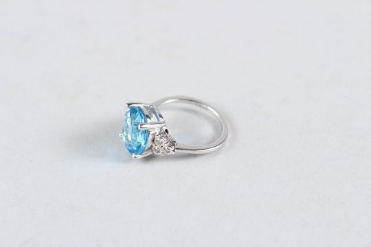 A 9CT GOLD, BLUE TOPAZ AND DIAMOND RING.
