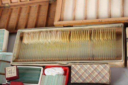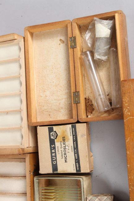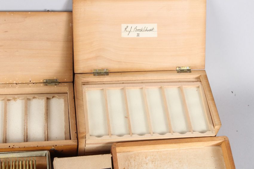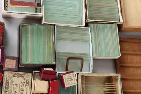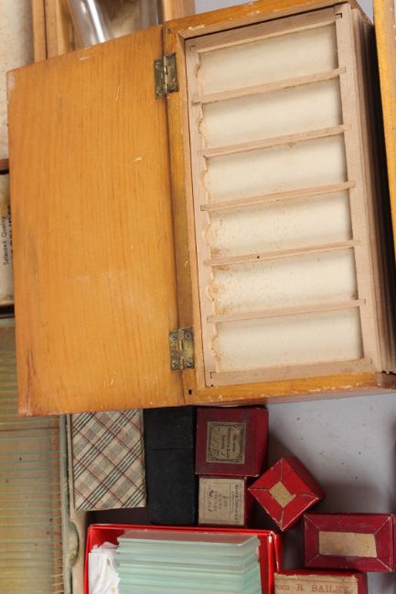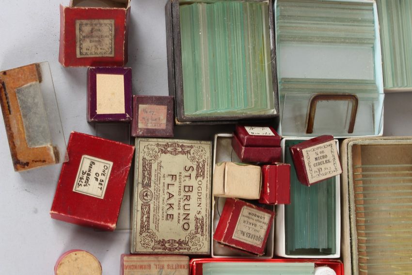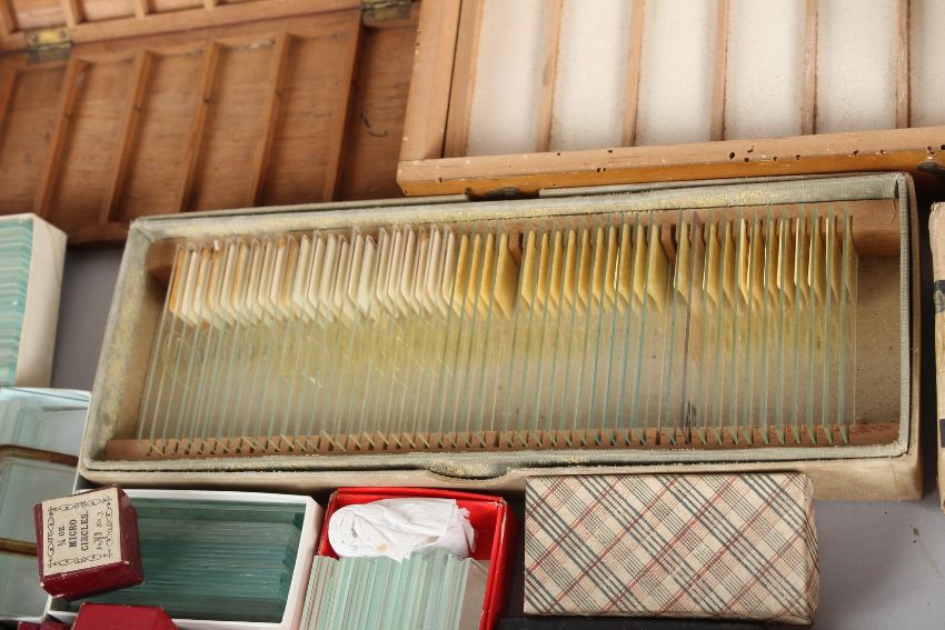 A COLLECTION OF MICROSCOPE SLIDE BLANKS, storage boxes etc.